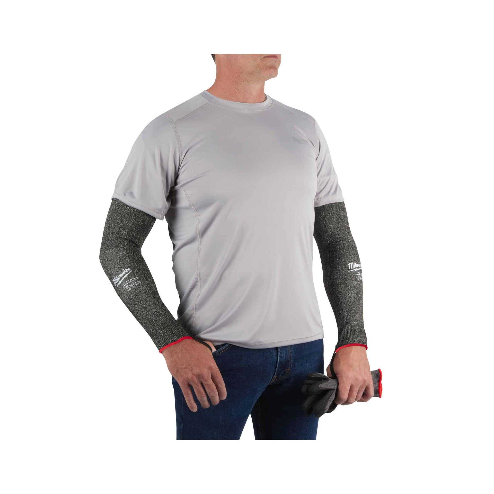 MILWAUKEE® Ärmskydd skärskydd E. Högstretchigt nylonmaterial med 4-vägs stretchpunkter för bästa passform. Avsmalnande design, bredare på biceps och tight på handleden, för att passa den naturliga armformen. Elastiskt band med halkfria punkter på biceps och stretchmanschett för att hålla ärmen på plats och förhindra att de hänger fel. Andningsbart och lättviktigt material ger bra fingerfärdighet och komfort hela dagen. Elastisk tumögla undviker tryckpunkter vid användning av handskar. Europeisk certifierad för skärskydd: EN ISO 21420, EN388:2016 (3X42E), UKCA.