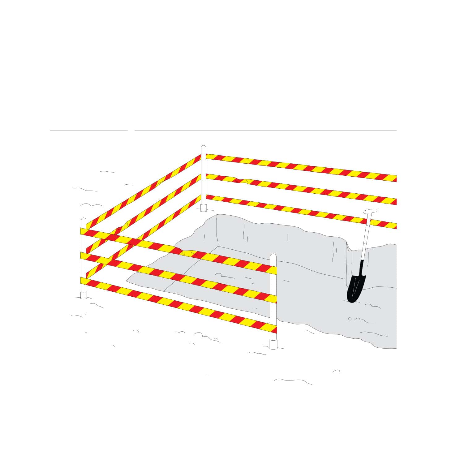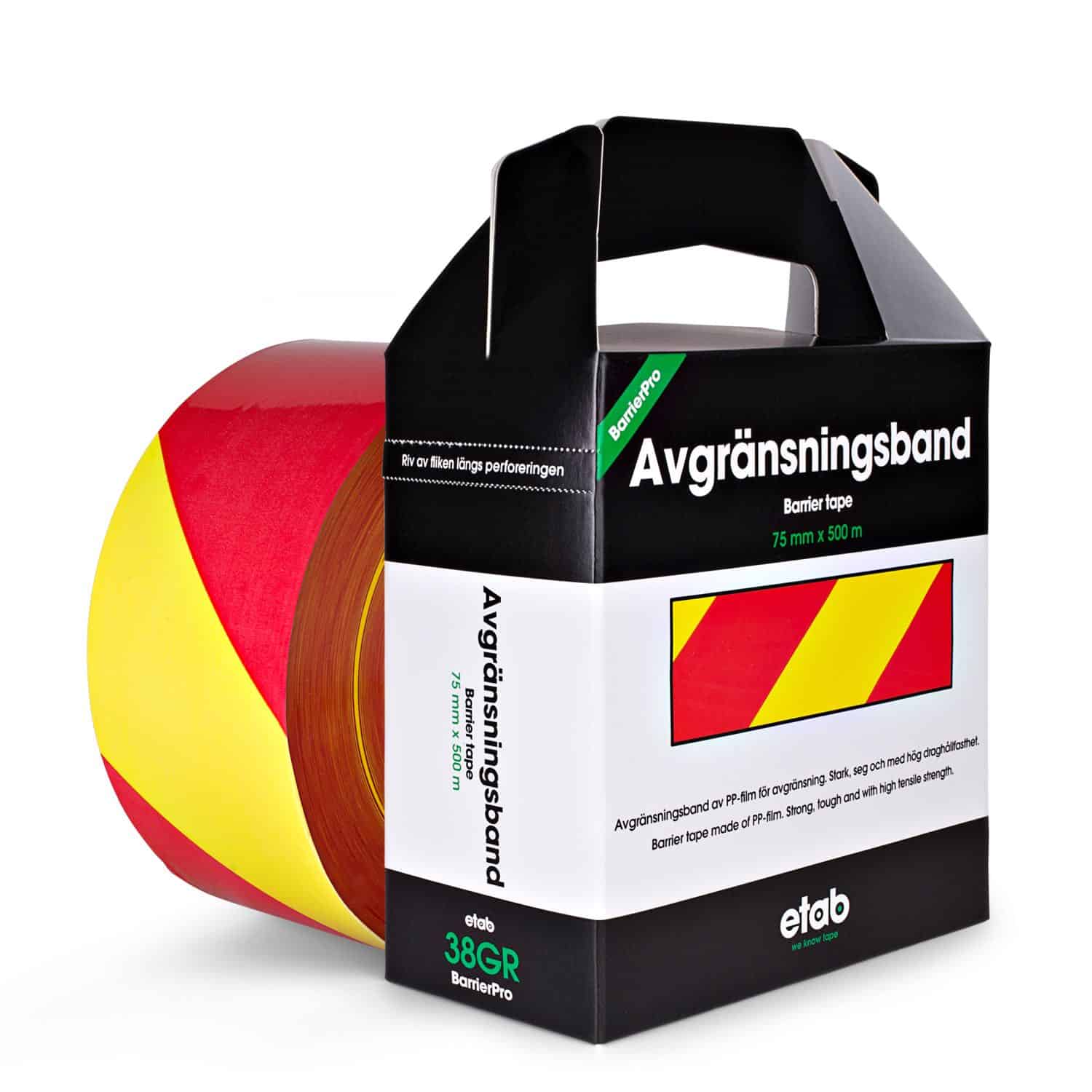 etab 38GR avgränsningsband har gul/röda diagonala ränder för att markera avgränsat område, finns även som varningsband (gul/svart) eller avspärrningsband (röd/vit).