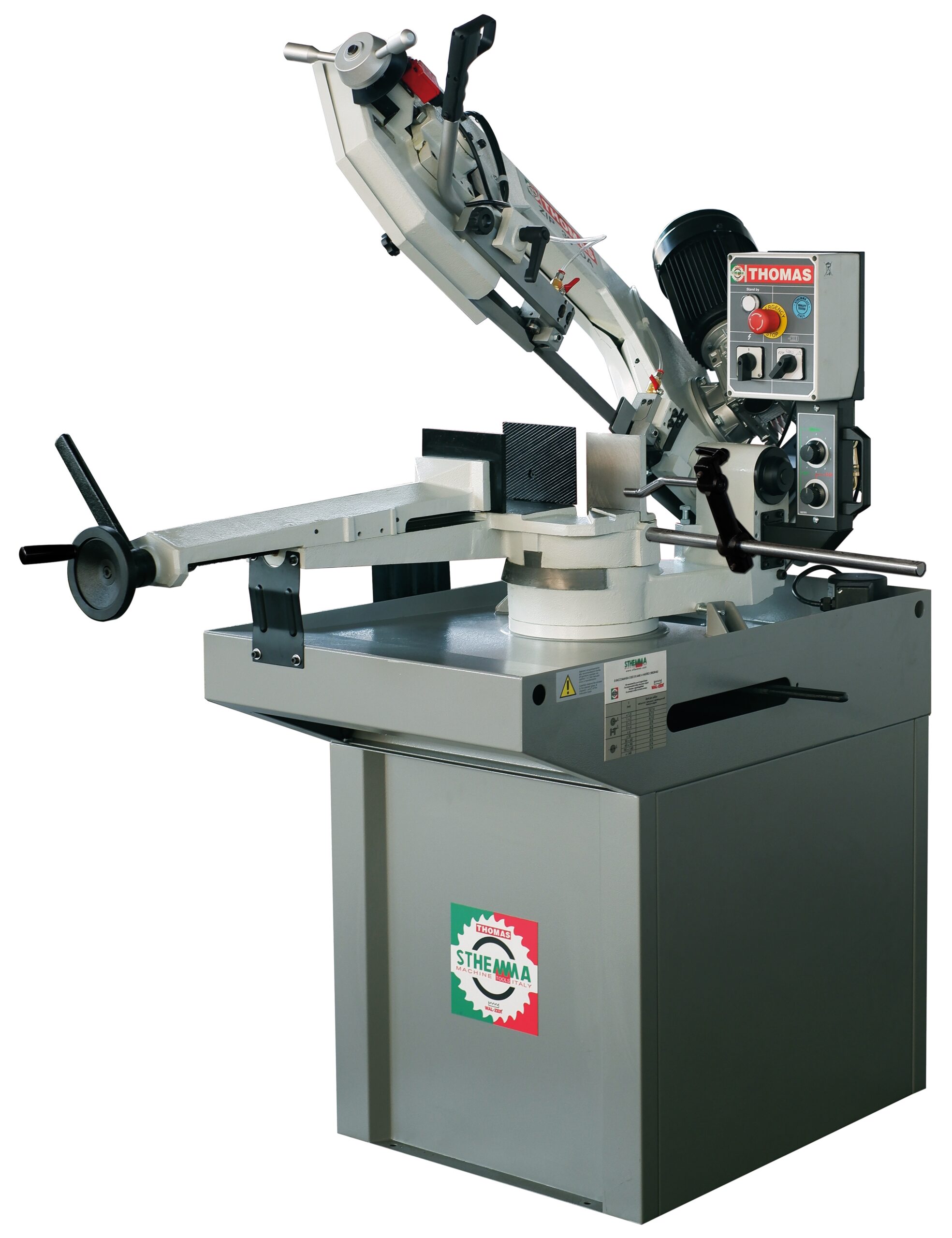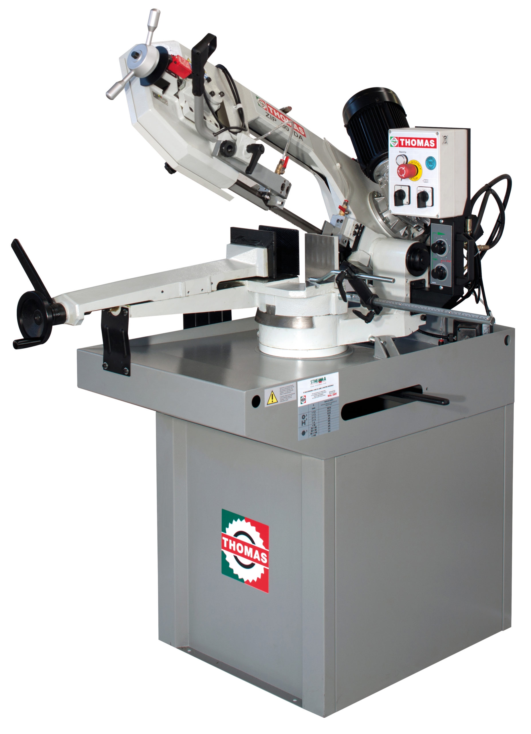 Bandsåg DA med hydraulisk kontrollerad nedmatning med ställbar hastighet för optimerad kapning. Genom att trycka ”PUSH” på regulatorn för hydrauliken så startar sågningen och sågbygeln går ner. Genom att trycka ”PULL” så stannar den, när sågningen är klar så stannar sågen och även kylpumpen automatiskt. Sågen gerar från 0° till 60° höger. Växellådan går i oljebad. Sågramen och skruvstycket är i gjutjärn. Säkerhetsbrytare på bladskyddet och bladspänningen. Två hastigheter. Precisionsstyrning av bladet med hårdmetallklackar och justerbara lager.