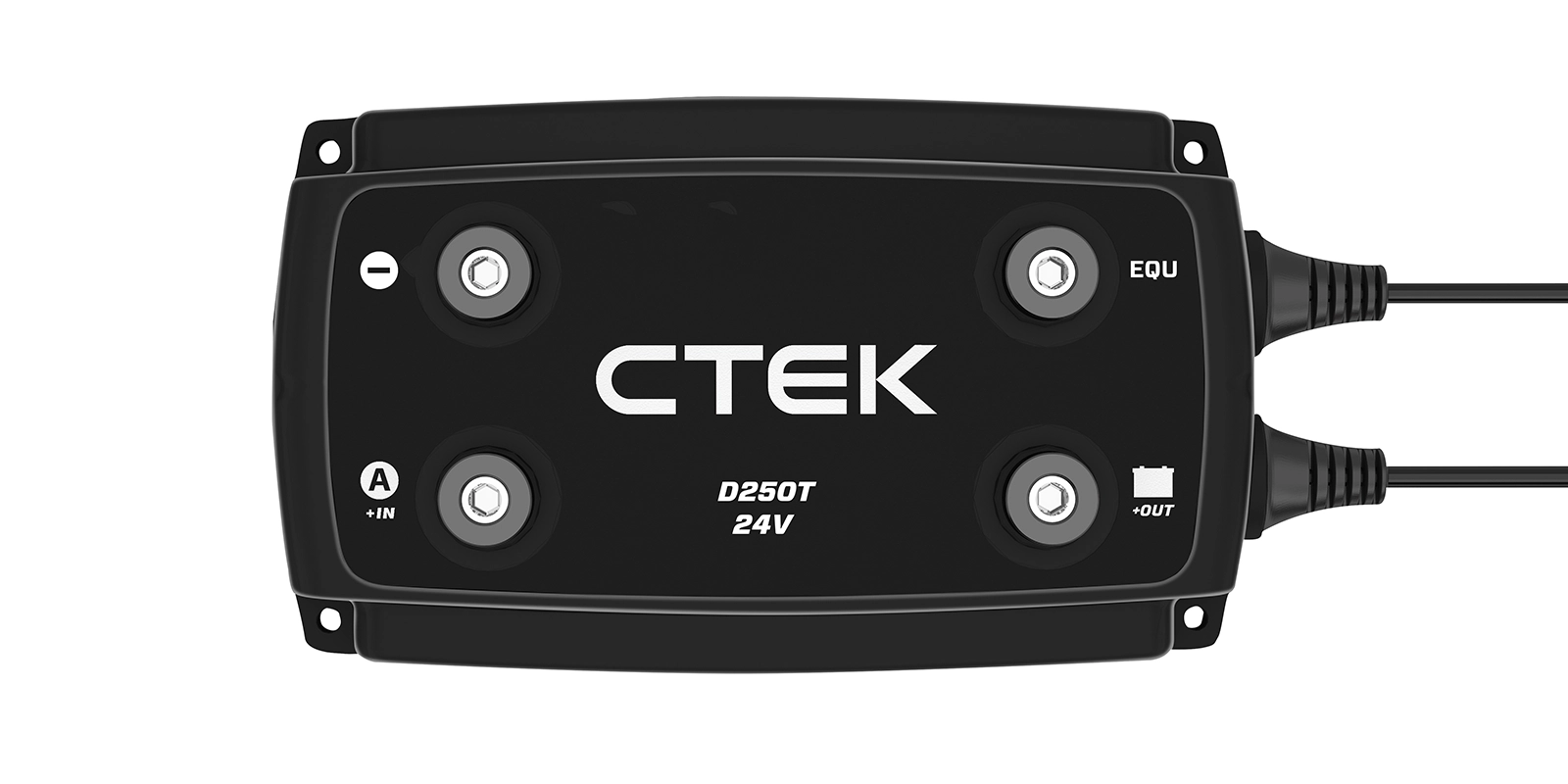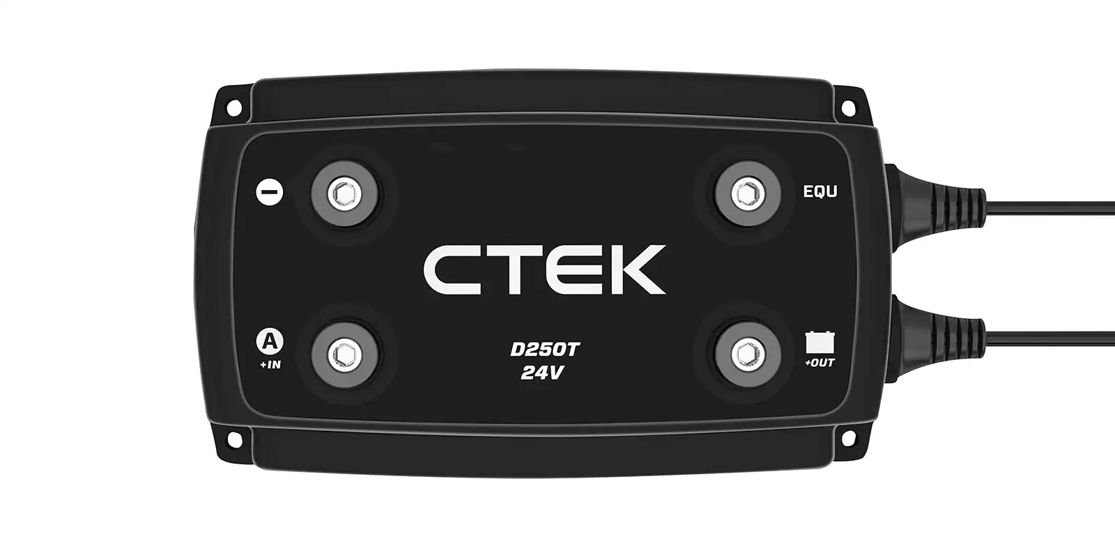 - Batteriisolator som ersätter behovet av dioder och VSR-reläer. D250T separerar startbatteriet från förbrukningsbatteriet när motorn är avstängd.