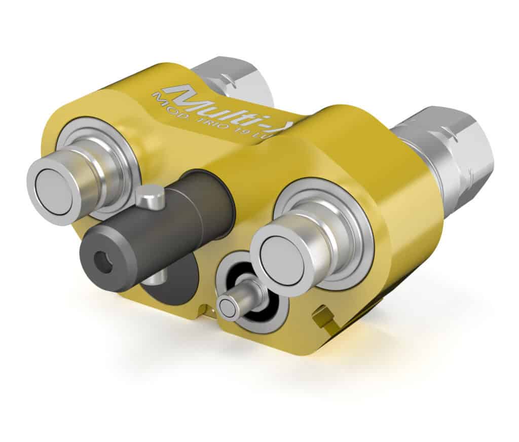 CEJNs Multi-X Trio 12.5 med smörjnippel är en multikoppling med 3 anslutningar, storlek DN12,5, där en av anslutningarna är en smörjnippel. Alla plattor har spillfria Flat-Face kopplingar i enlighet med ISO 16028. Nipplar med inbyggd tryckeliminator säkerställer en smidig anslutning, även vid högt resttryck. Ett arbetstryck på upp till 35 MPa kan användas på båda 1/2″-anslutningarna samtidigt. Specialkopplingen för centralsmörjning har ett max arbetstryck på 150 bar. Smörjnippeln har en bypassfunktion när den är urkopplad och är ett väldigt bra val för system med centralsmörjning. Multi-X kopplingen kan också utrustas med elektriska kontaktdon.