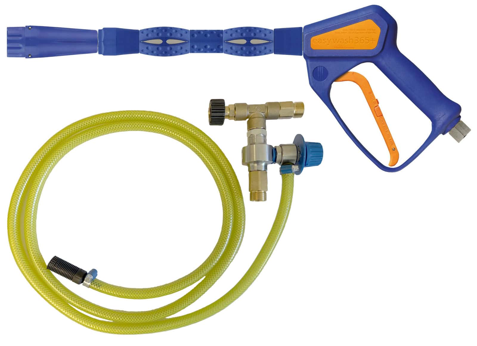 Rostfri injektor med skumlans för högtryck. Max 350 bar / 90ºC. Injektorn som sitter på en T-koppling installeras mellan utgången på tvätten och högtrycksutrustningen. Högtrycksslang upp till 40 meter är tillval, går även att köras med högtrycksvinda. Den redan existerande högtrycksutrustningen används som vanligt och skumutrustningen för sig men drivs av samma tvätt utan omkopplingar mellan momenten i tvättningen. Enorm tidsbesparing genom att inte behöva byta utrustning.