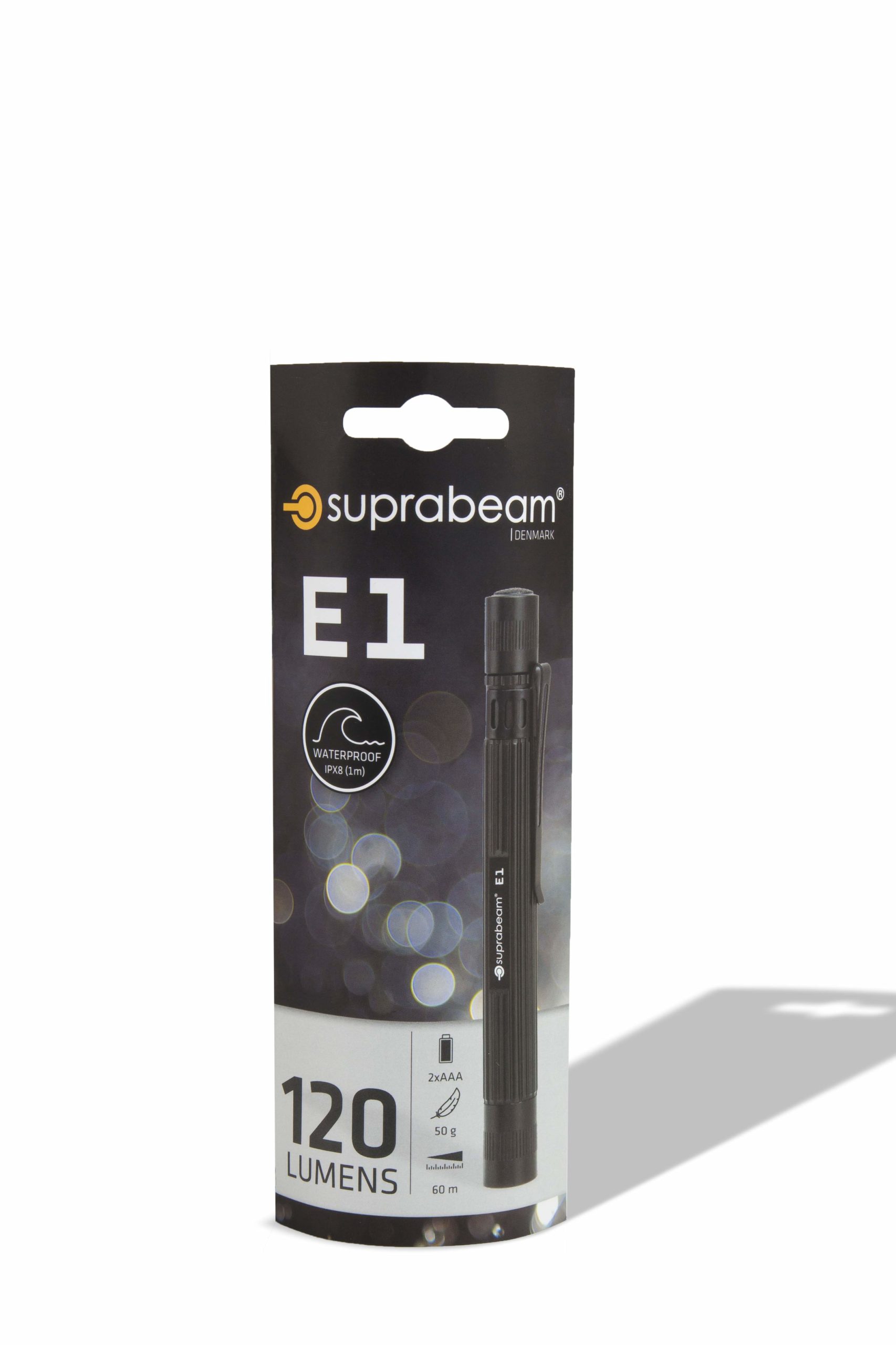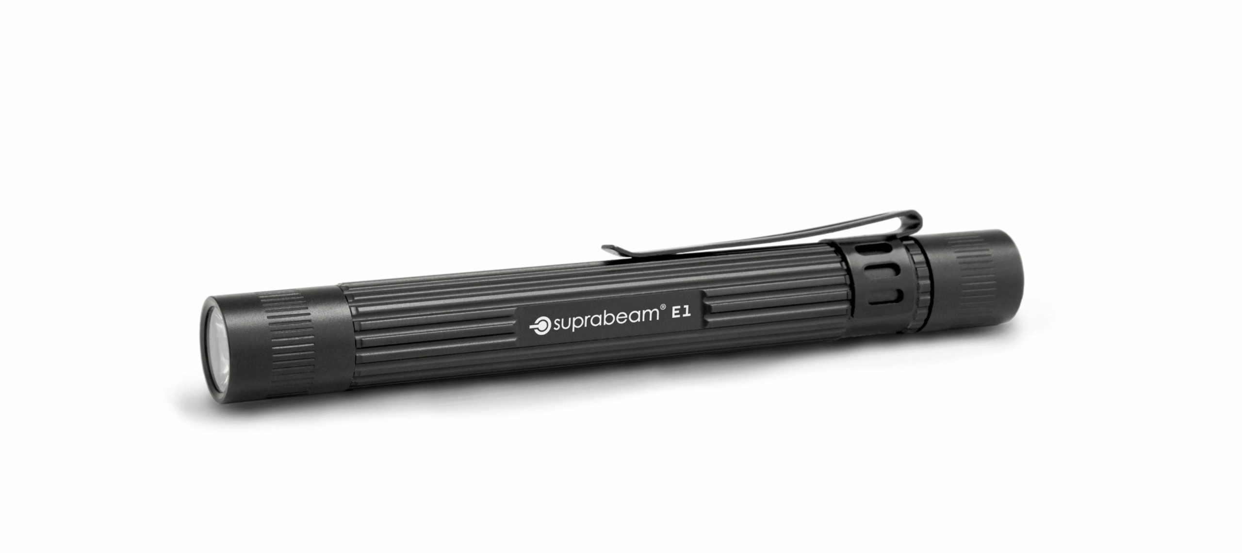 E står för ”essential” eller “grundläggande” vilket präglar seriens egenskaper. Modell E1 penn-ficklampa har endast de nödvändigaste funktionerna och har en robust design med en mekanisk på/av-knapp. En enda LED-krets i modell E1 ger 120 lumen i en perfekt fokuserad ljuskägla. Om du är ute efter en enkel men pålitlig ficklampa i pennformat, är E1 vad du söker. E1-modellen använder 2st AAA-batterier och har en drifttid på hela 3 timmar, men väger endast 50 gram.