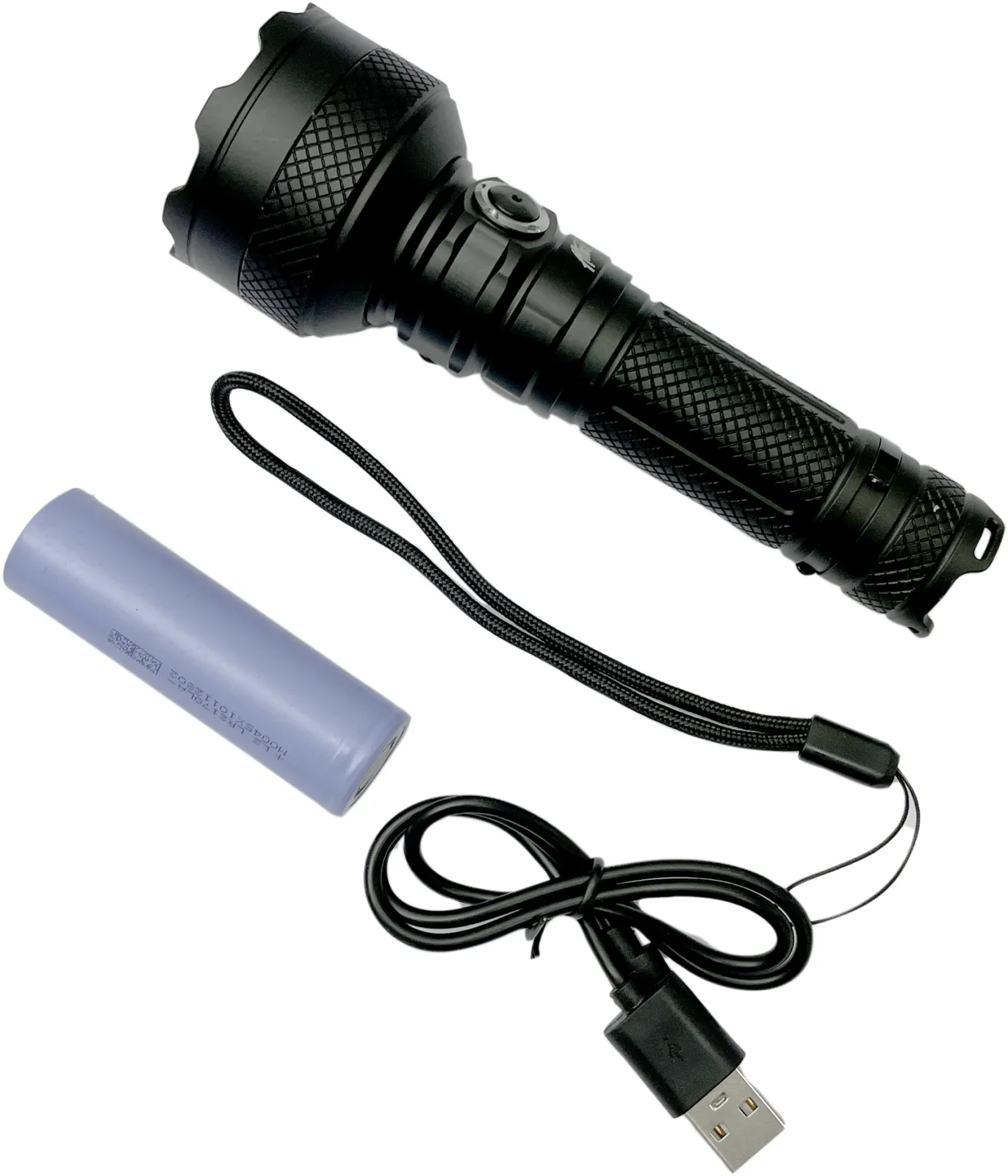 Kraftfull LED-ficklampa som kan justeras i fem olika belysningslägen, upp till 5000 Lumen. Den starkaste nivån (turbo-läge) återgår till lägre nivå efter ca 20 sekunder. Laddkabel (USB-A till USB-C) och clips medföljer.