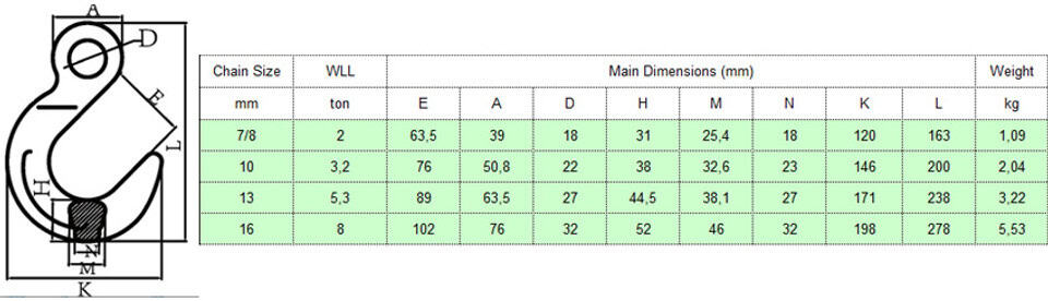 Används där lyftämnet kräver en krok med stort gap. Kopplas till kättingen med kopplingslänk.