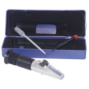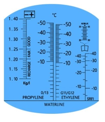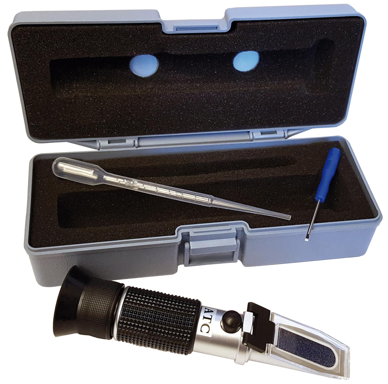 Optisk vätskeprovare för glykol (etylen/propylen), spolarvätska (etanol/isopropanol), ADBLUE och batterisyra. Tillverkad i metall och levereras komplett i plastbox. Längd: 160 mm, Vikt: 300 gram