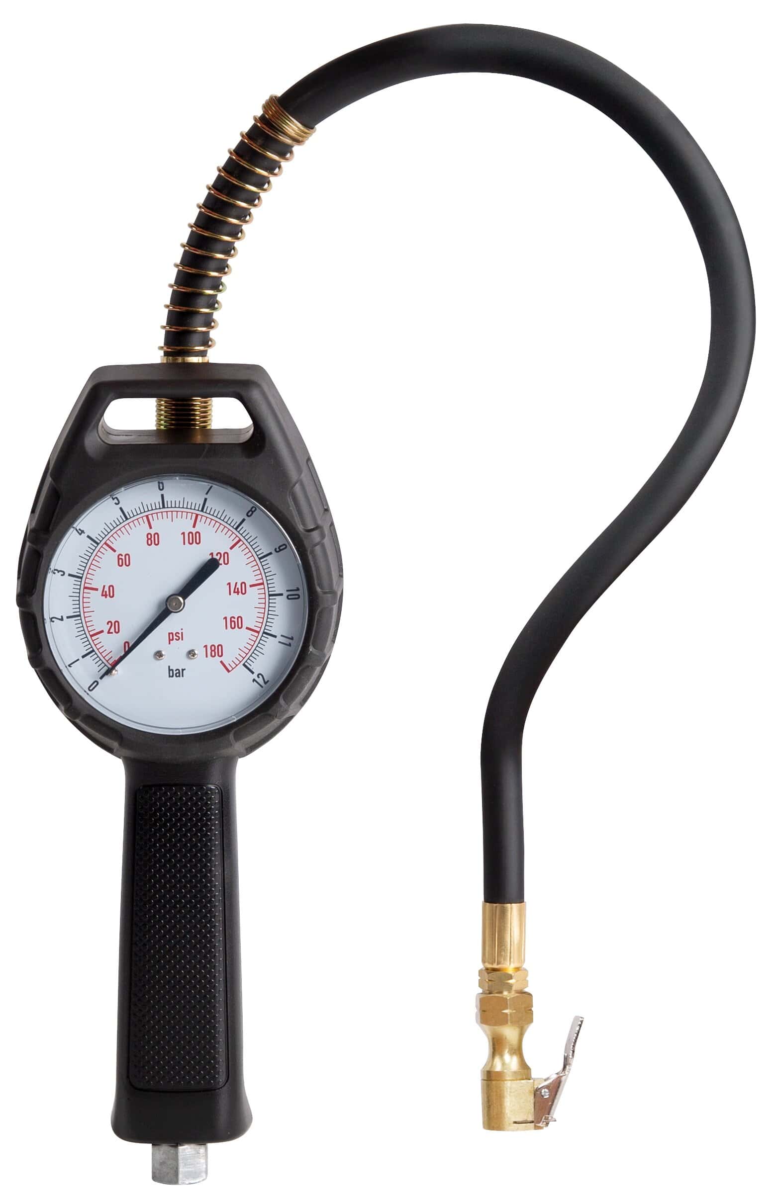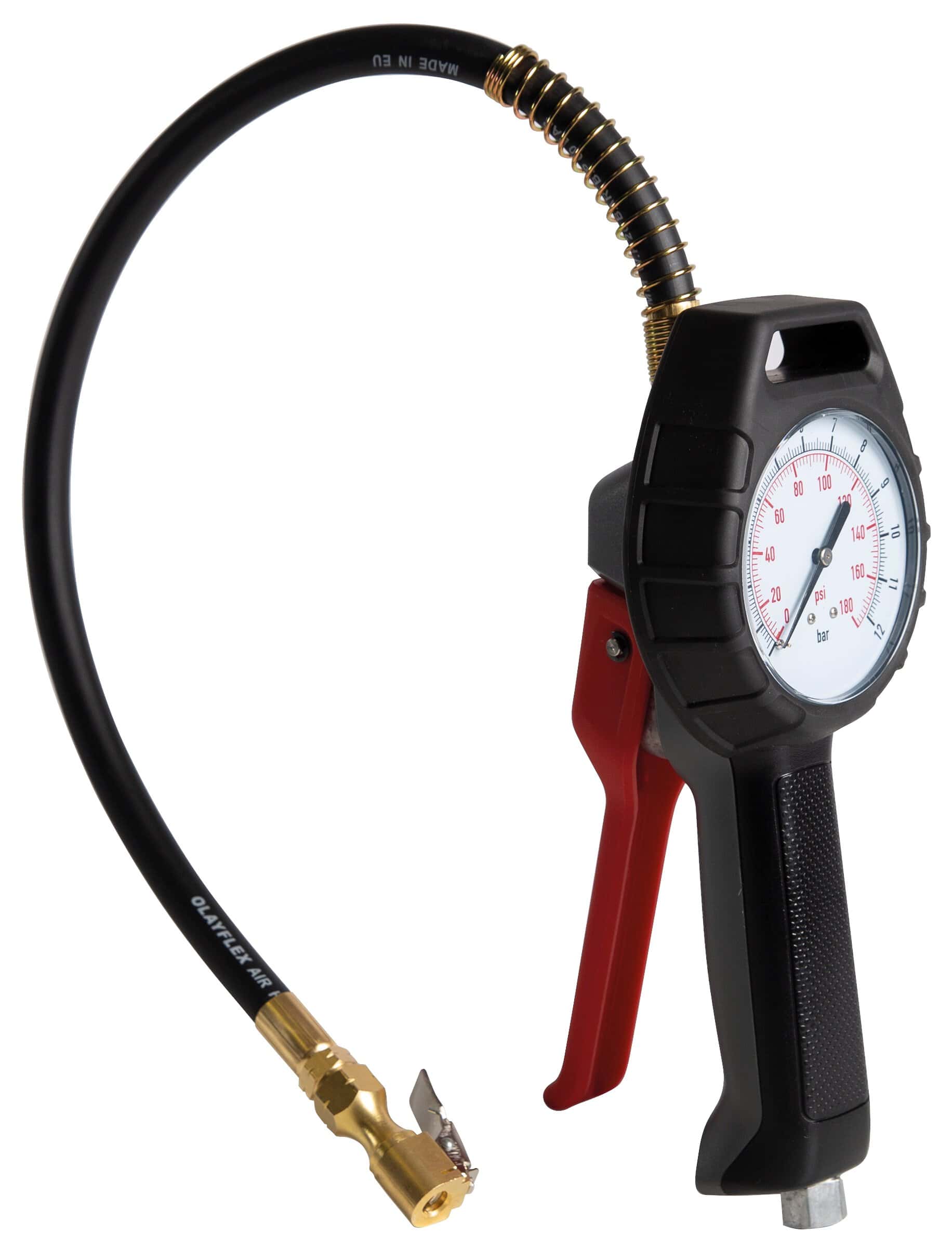 Lufttryckmätare med aluminium-kropp i robust och stöttåligt gummi hölje. Direktverkande ventil för hög flödeshastighet. Individuellt testade med certifikat. Utrustad med svirvelkoppling. Uppfyller industritoleranserna EC86/217. Slangen är utrustad med låsspärr för ventilen.