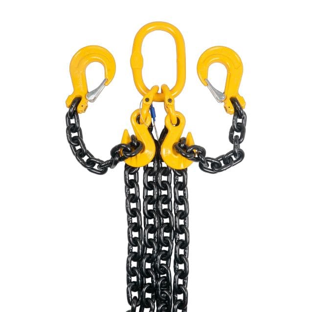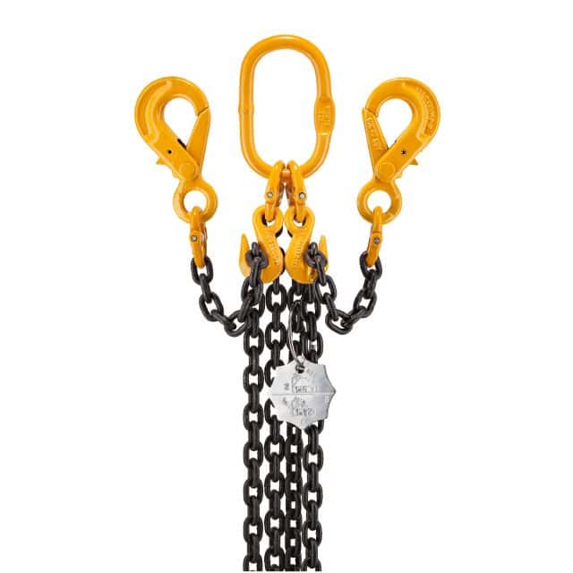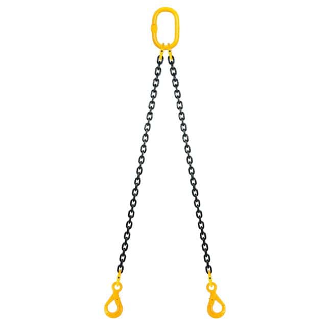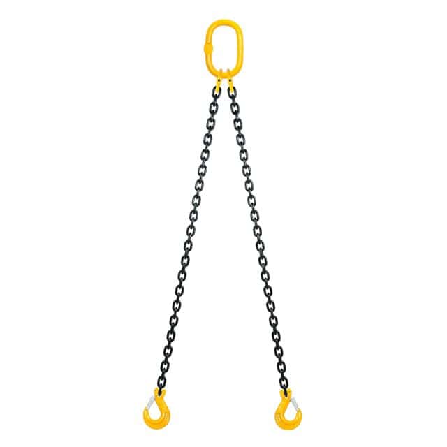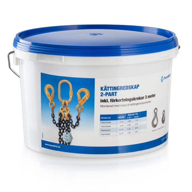 2-parts kättingredskap i klass 8 med säkerhets- och förkortningskrokar. Observera att angiven maxlast gäller under förutsättning att parterna är lika belastade.