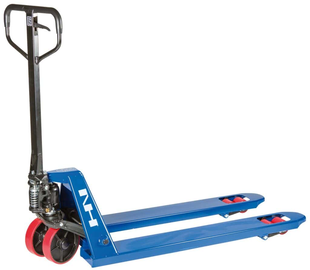 Underhållsfri gaffelvagn med slitstarkt chassi för tuff och tung hantering. Normal lyftfunktion för lätt lyftning av tunga laster. Inbyggd överlastventil och underhållsfria bussningar. Lyfthastighet 7 mm/slag. 5 års garanti på pumpen.