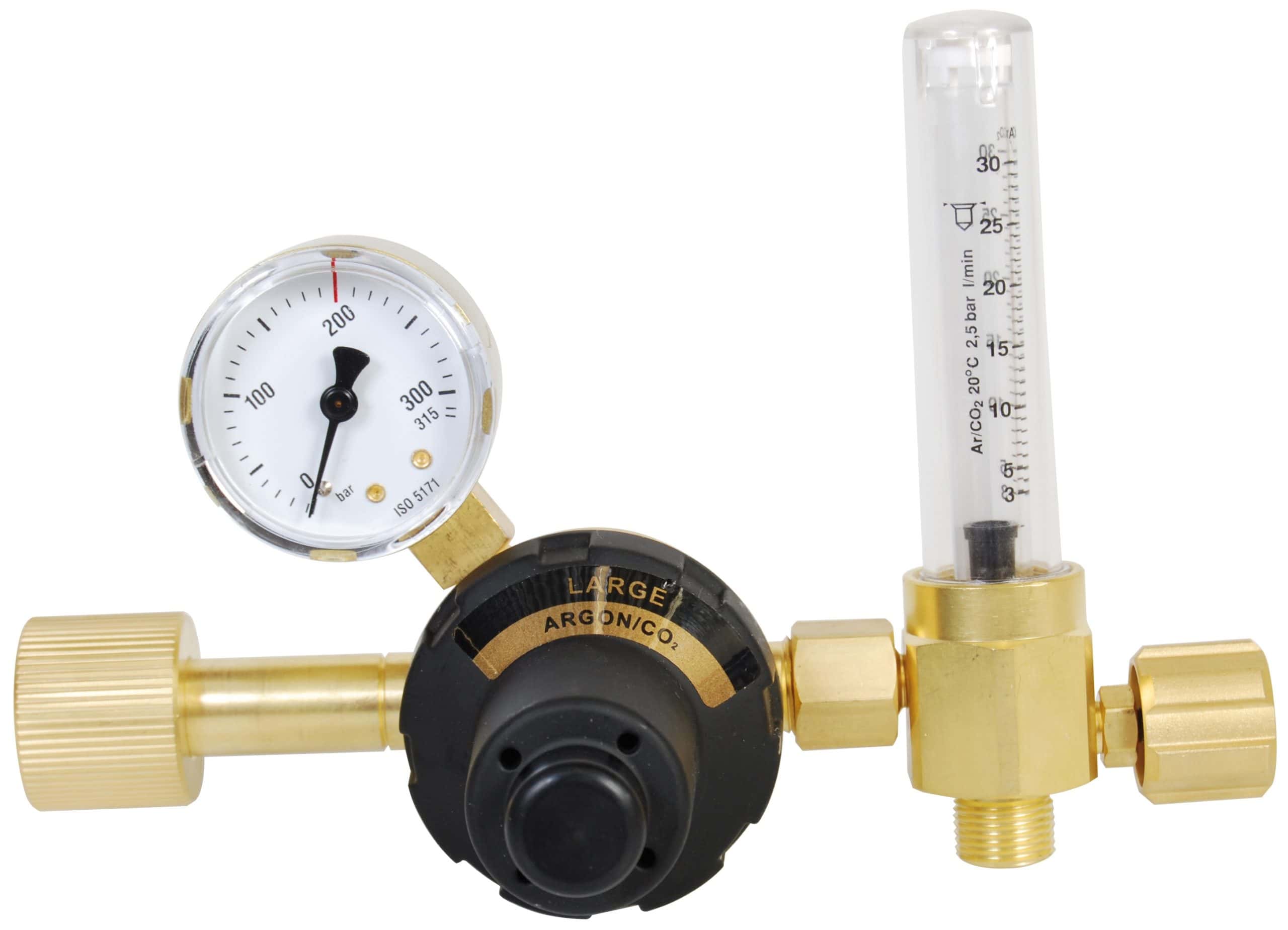 Regulatorn utrustad med manometer som visar kvarvarande innehåll i flaskan, samt flödesmätare med svävande kropp, som visar flödet mot en graderad skala liter/minut. Regulatorn är förinställd på ett arbetstryck på 2,5 bar och anpassad för argon.