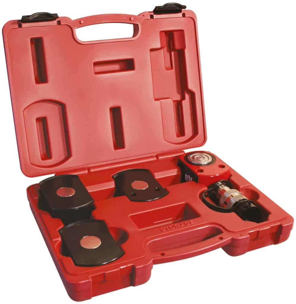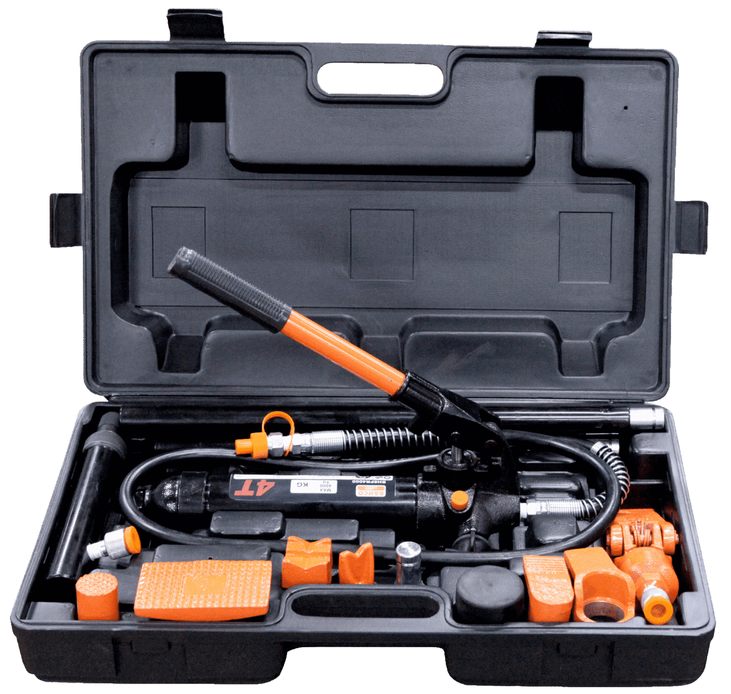 Varje sats innehåller: Handpump, slang, hydraulisk cylinderkolv, spridare, gummihuvud, gummiförsedd platt tryckplatta, 90° V-formad tryckplatta, räfflad sadel, utvändig gängadapter och ett brett urval förlängningsrör
