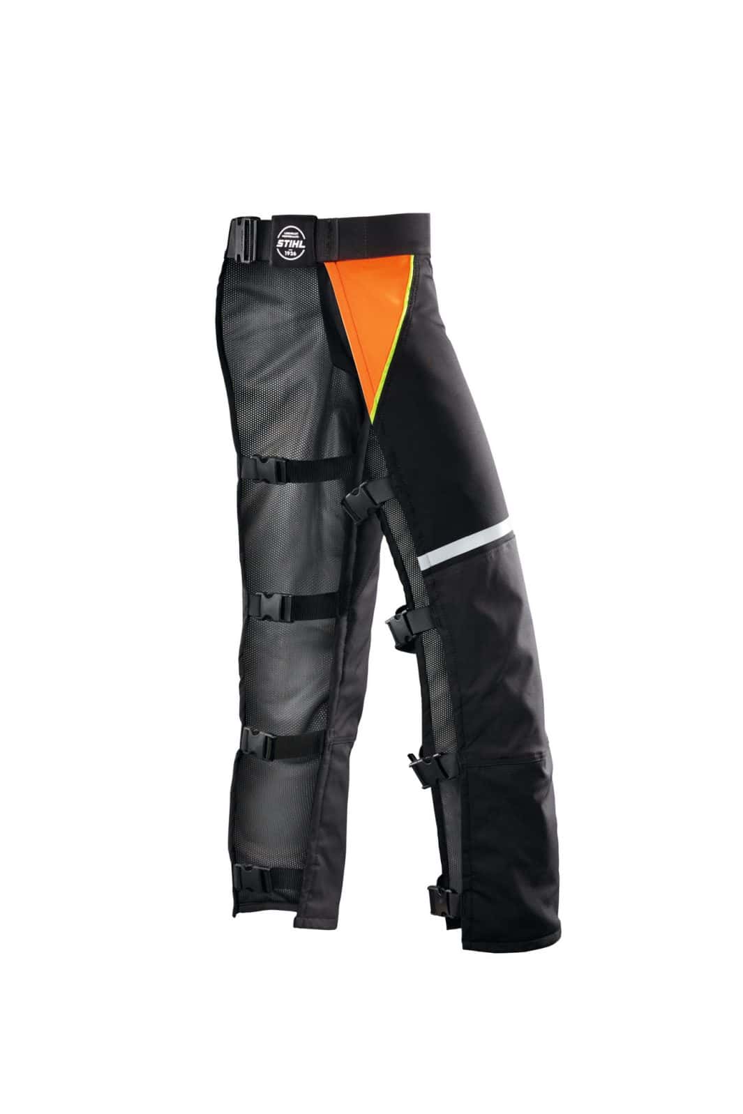 STIHL FUNCTION Core 270° benskydd med frontskydd erbjuder ett bra skydd vid alla motorsågsarbeten och fästs med remmar, vilket gör dem enkla att ta på över arbetsbyxor och ta av utan att behöva ta av skorna.