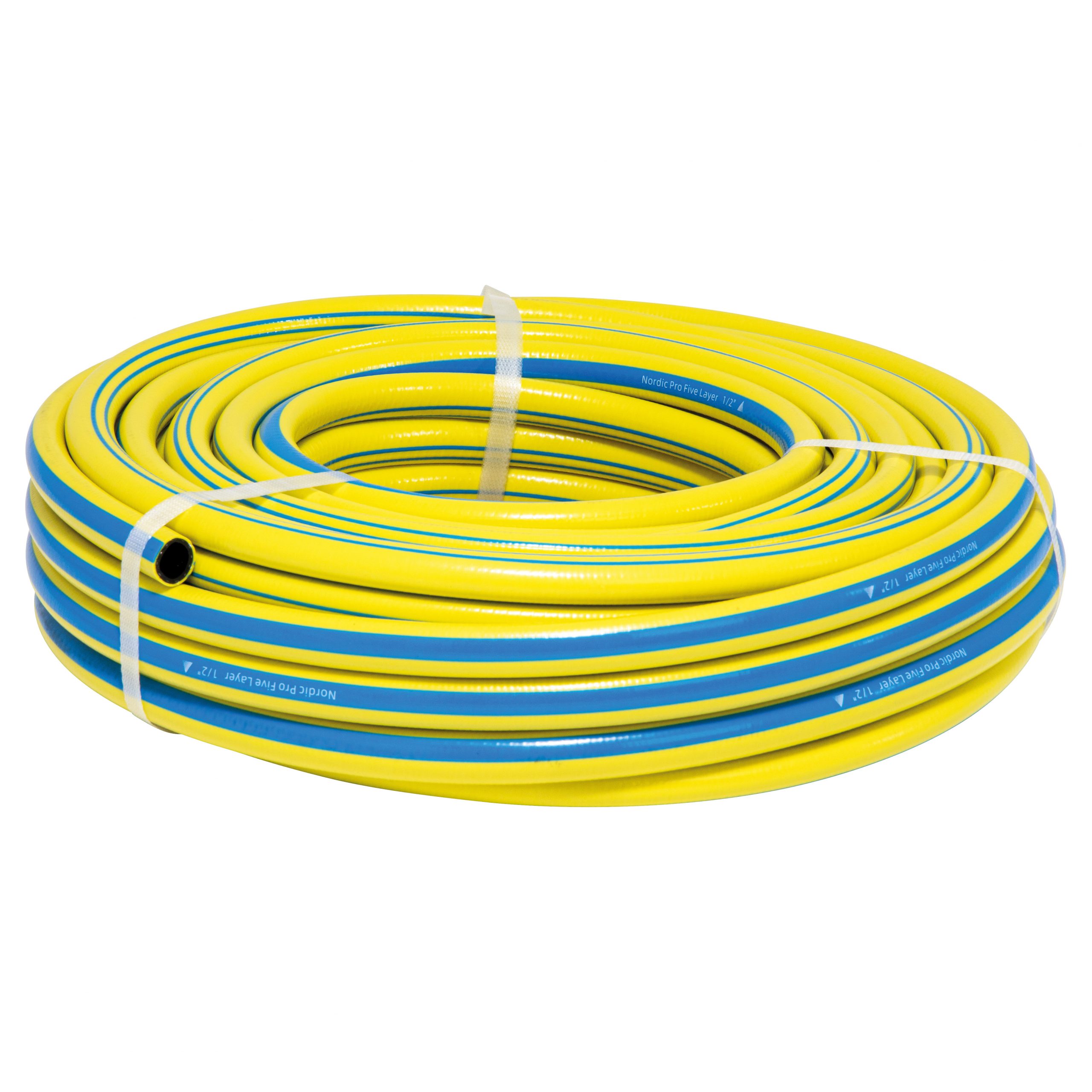 Flexibel och slitstark 5-lagrad PVC-slang med vävd och stickad polyester armering. För bevattning och liknande användning, vid temperatur -10°C till +60°C.