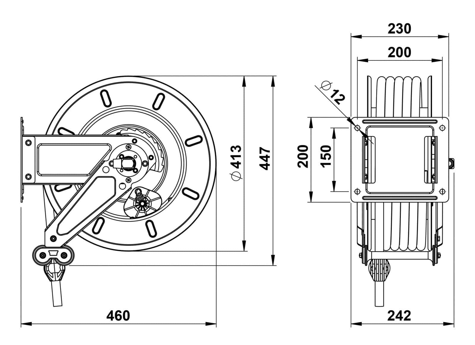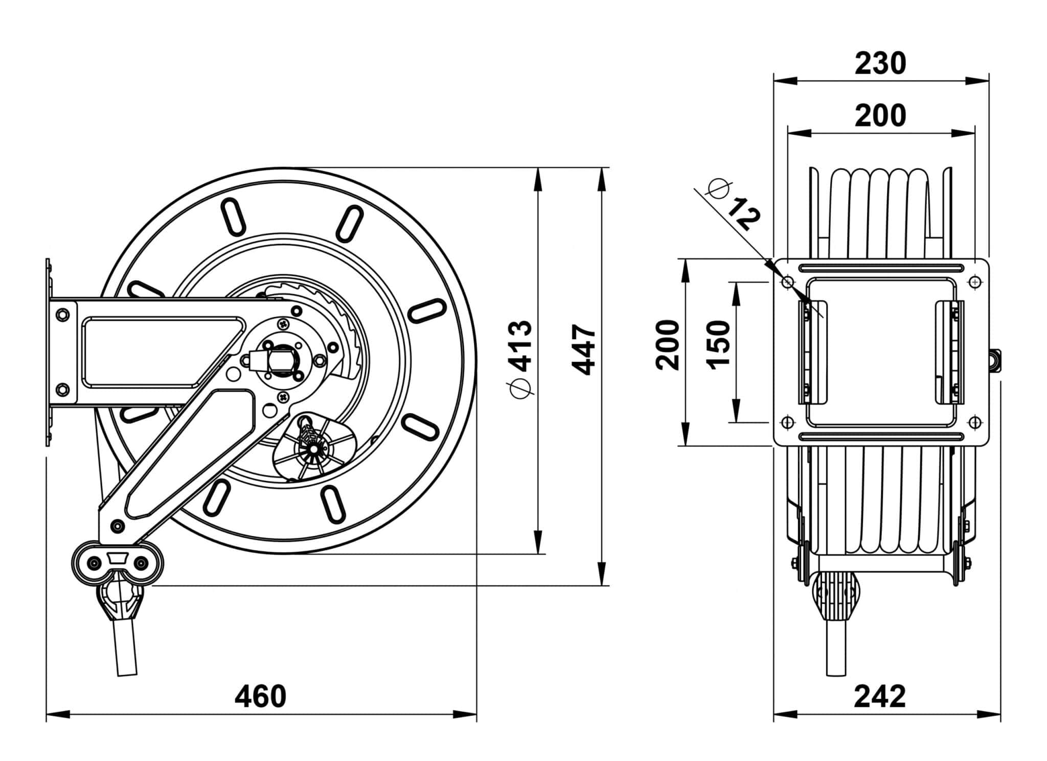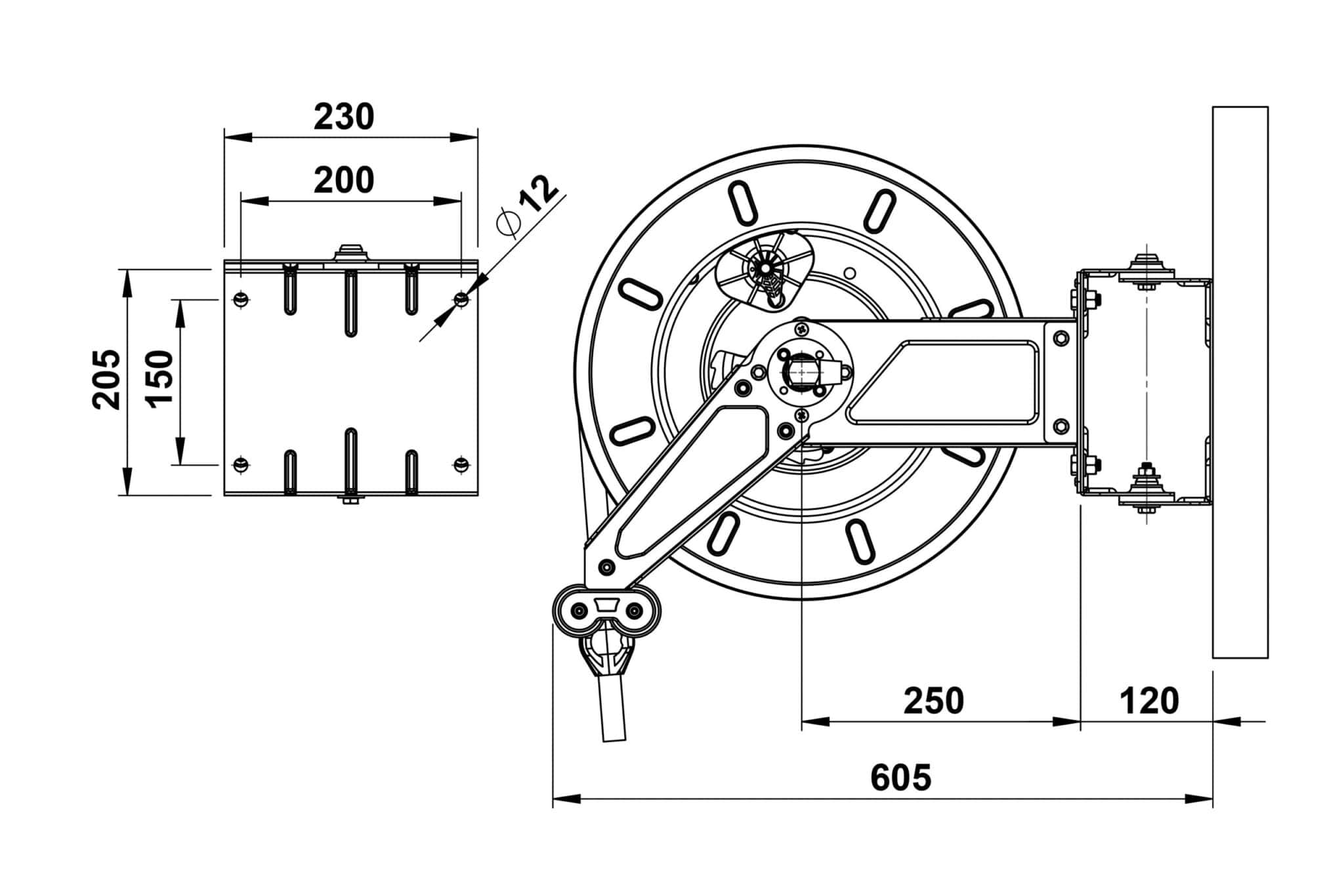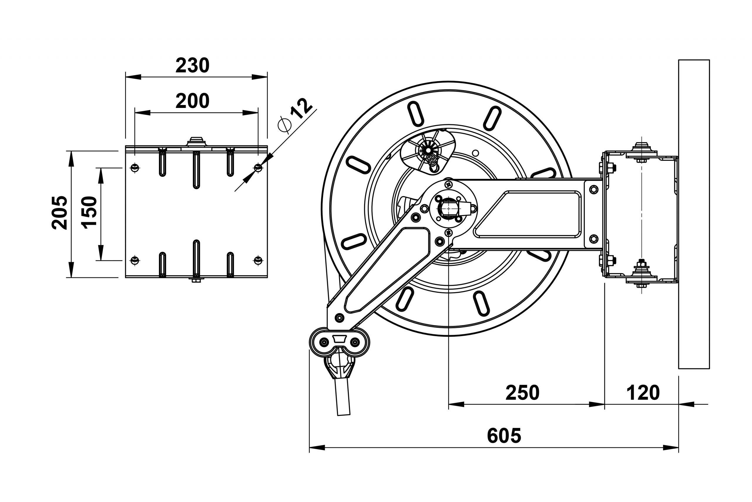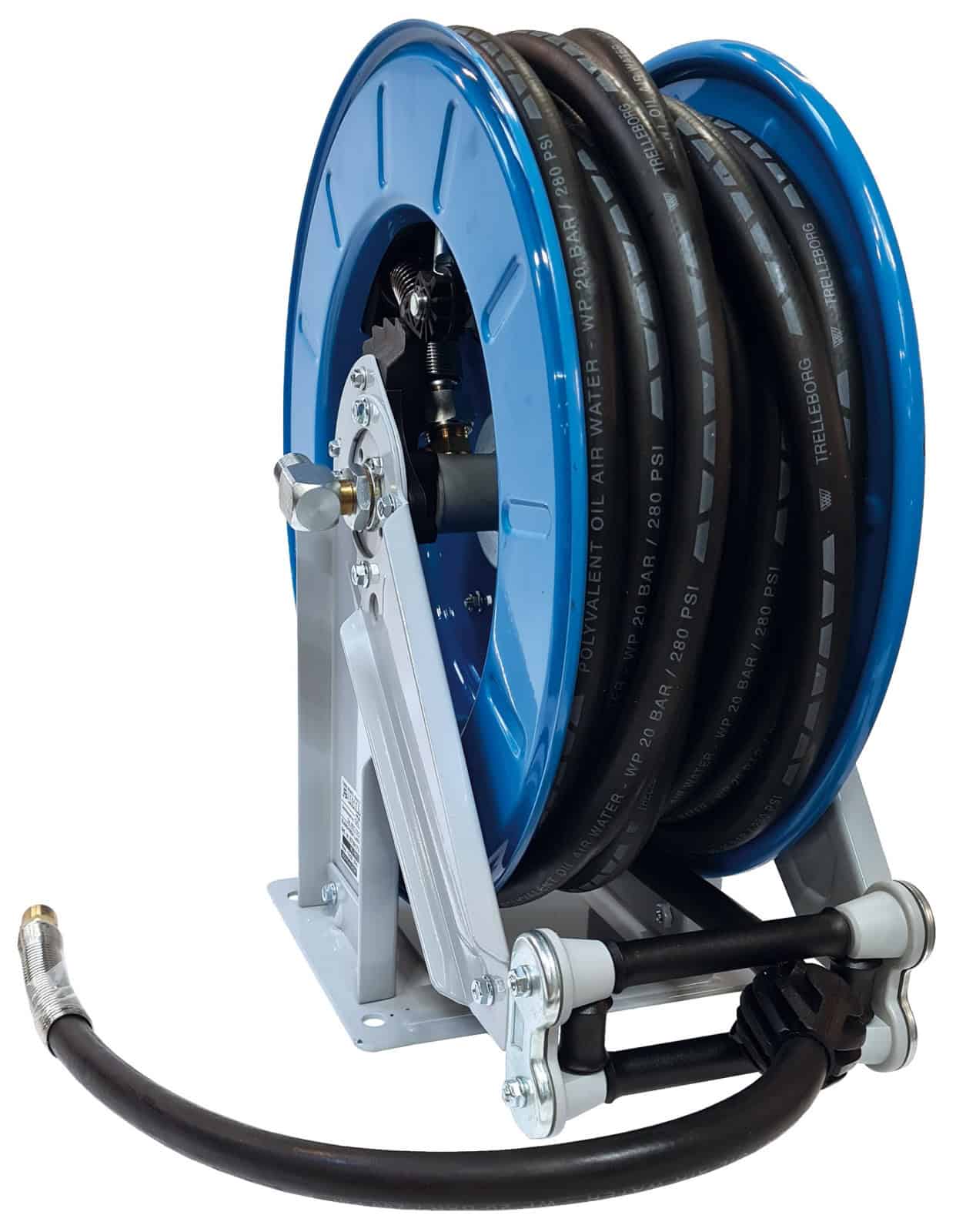 Slangvinda försedd med ställbara utmatningsarmar. Lätt att placera, även i trånga utrymmen. Kan även takmonteras. Vindan är pulverlackerad och utrustad med returfjäder. Kan kompletteras med svängbart väggfäste om slangen skall dras ut eller matas in i sidled. Slitaget på vindan blir mindre och slangen rullas upp jämnare. Vindorna avsedda för alkaliska kemikalier, ej kallavfettningar.