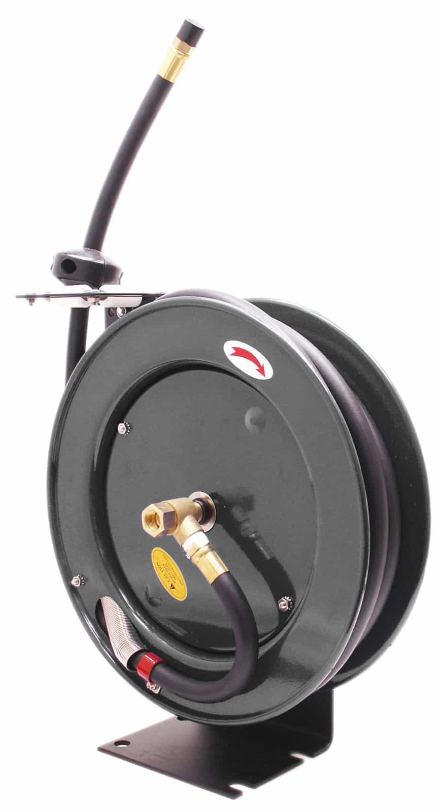 Slangvinda försedd med ställbar utmatningsarm. Vindan är pulverlackerad och utrustad med returfjäder. Kan kompletteras med svängbart väggfäste om slangen skall dras ut eller matas in i sidled. Slitaget på vindan blir mindre och slangen rullas upp jämnare. Oljebeständig gummislang.