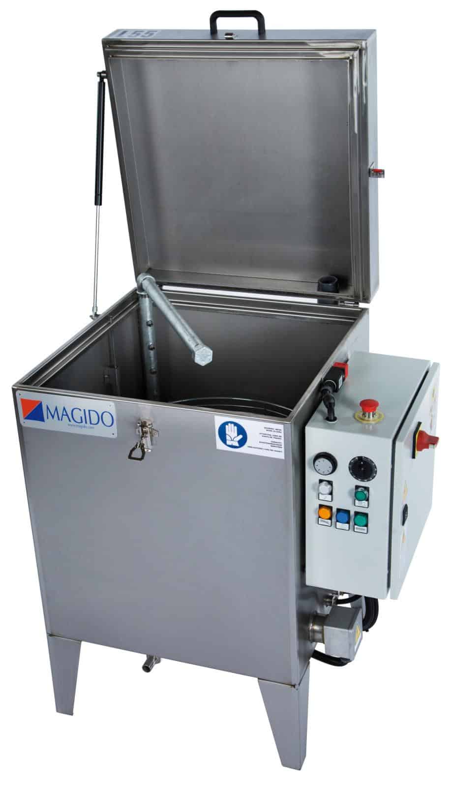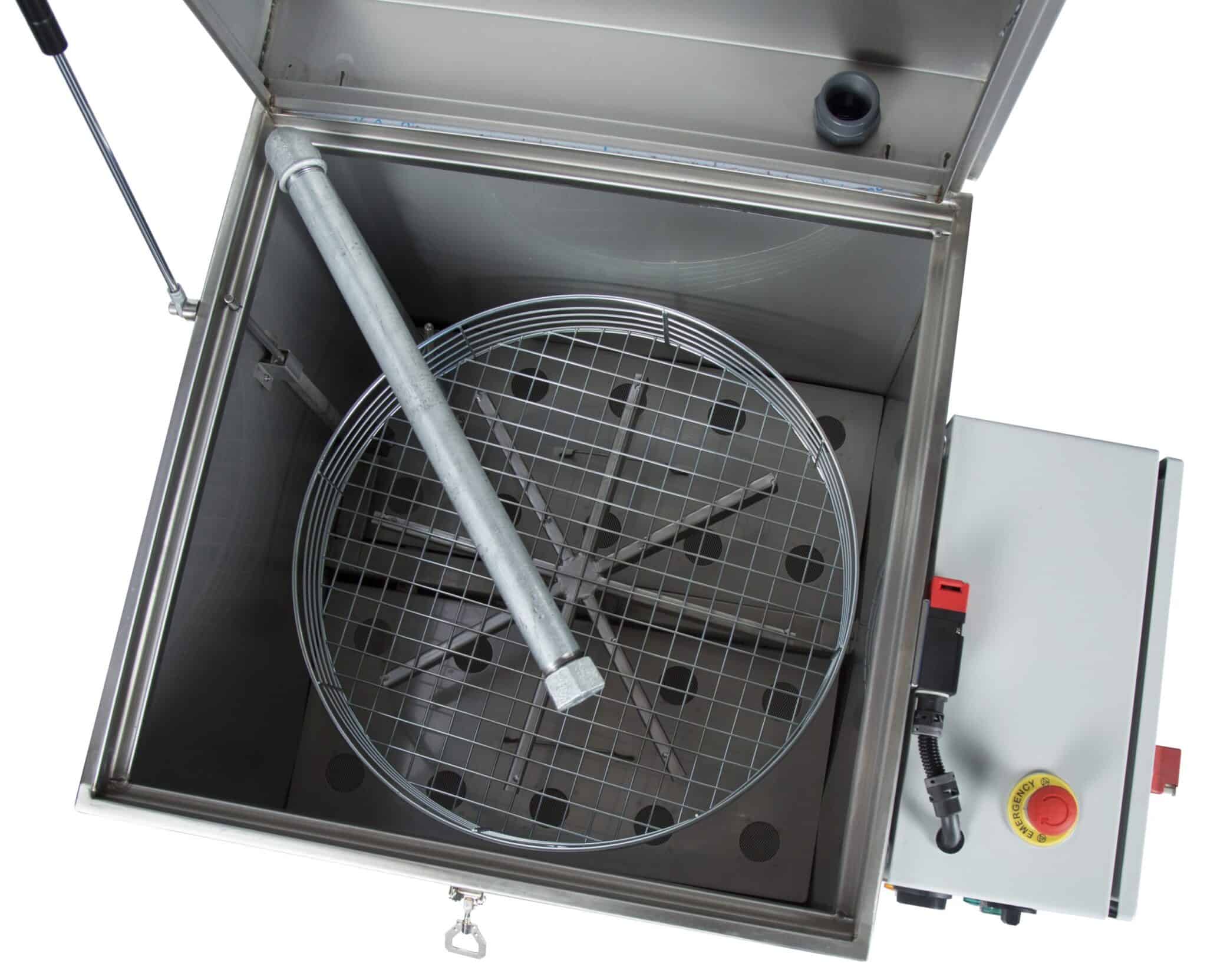 Automatisk smådelstvätt i rostfritt stål med värme. Spolröret med dysor är fast. Godskorgen roterar.