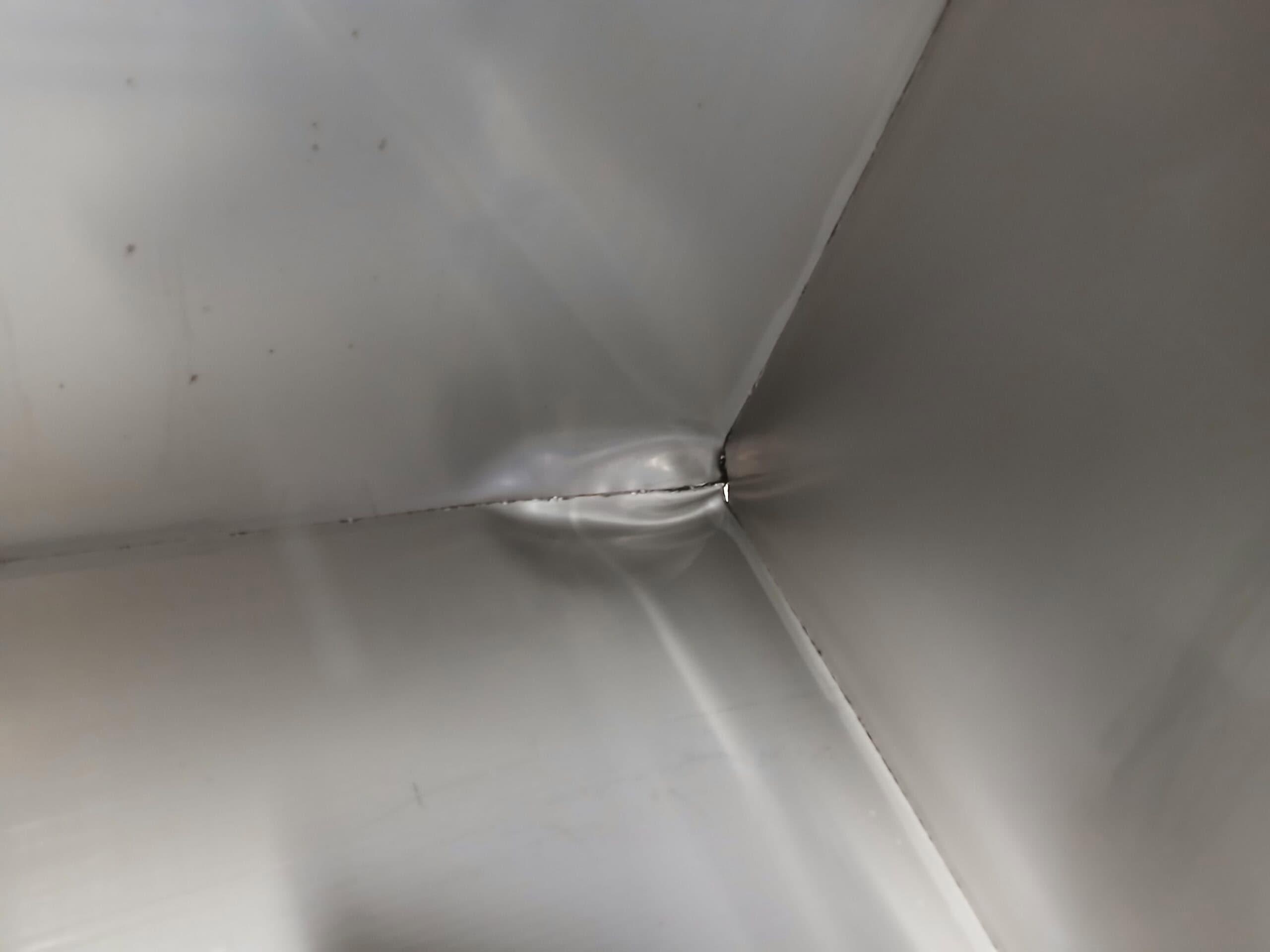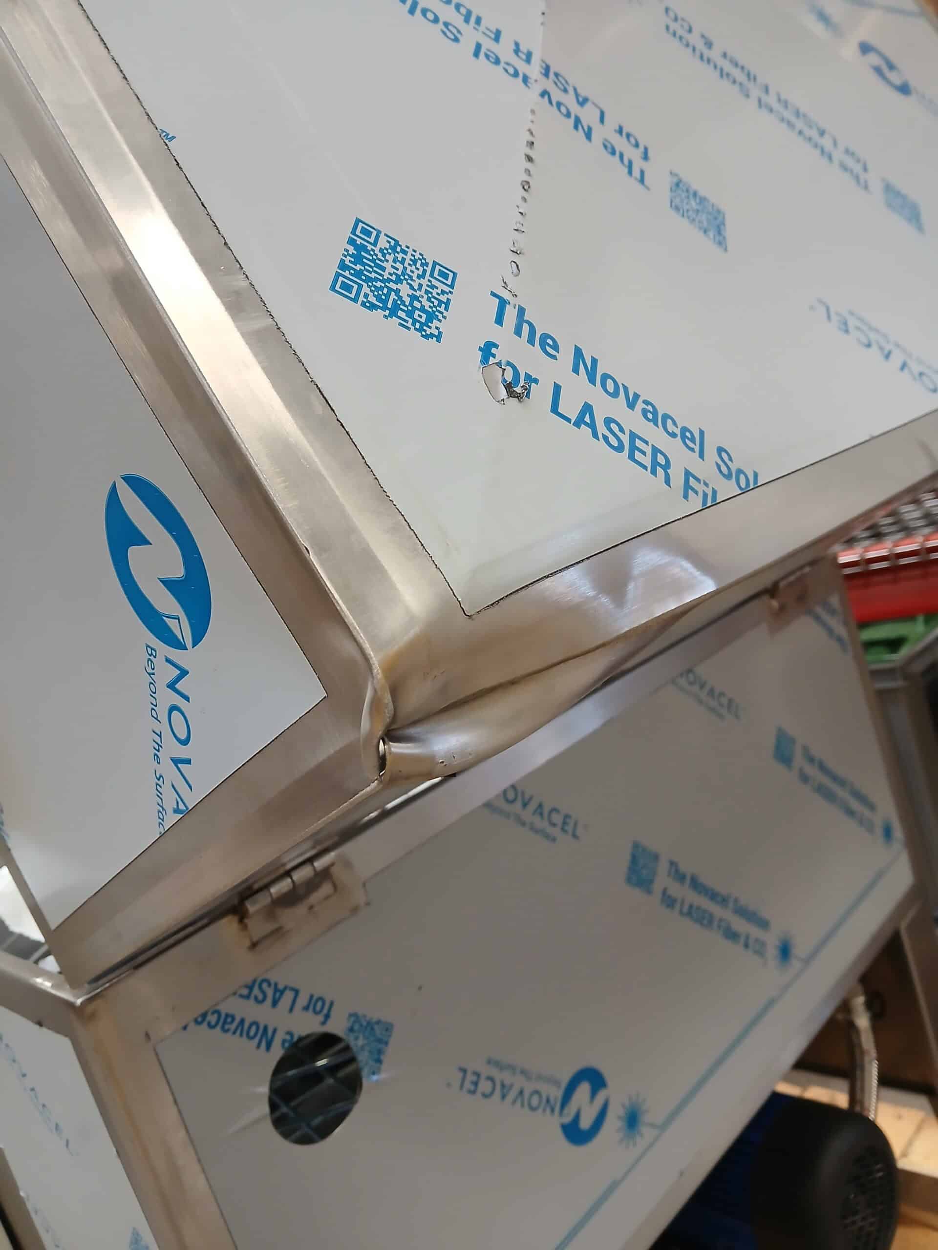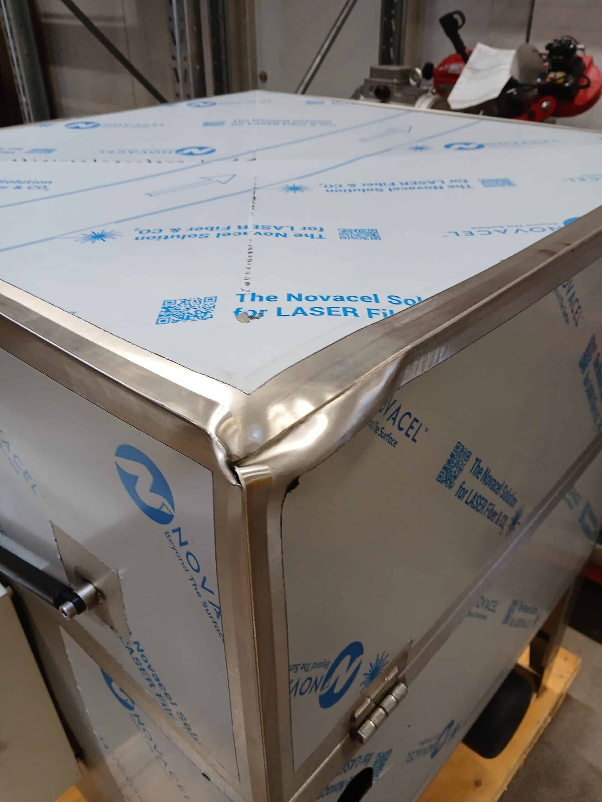 Transportskadad maskin som vält, buckla i hörn, bör svetsas, Liten byckla i korg.