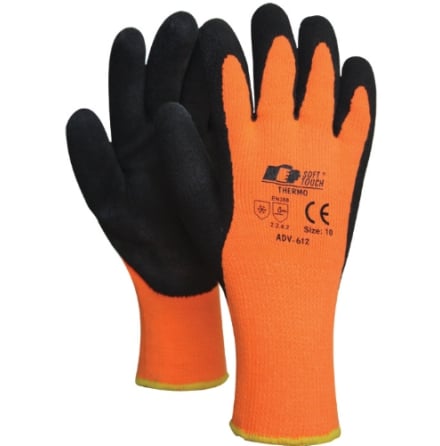 Sömlös stickad orange bomull/polyesterhandske i vintermodell med grå latexbeläggning i innerhand och på fingertoppar för mycket bra grepp.