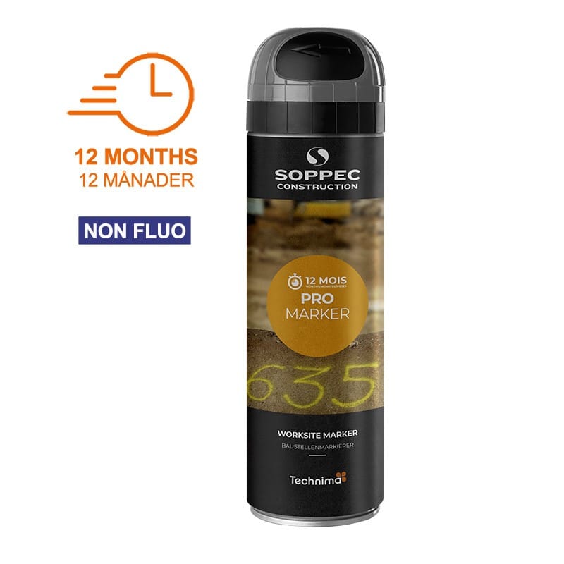 Markeringsfärg i sprayflaska som finns i flera solida färger. Tack vare den grå märkfärgens goda täckförmåga kan du måla över felaktiga markeringar på asfalt. Markeringsfärgen används med fördel vid bland annat vägarbeten, markarbeten, rörläggning, bygg, vid elektriska installationer mm. Enkel att använda och fäster bra även på fuktiga underlag, som t.ex. betong, asfalt, gräs, grus, trä mm. Färgens varaktighet är 9–12 månader.