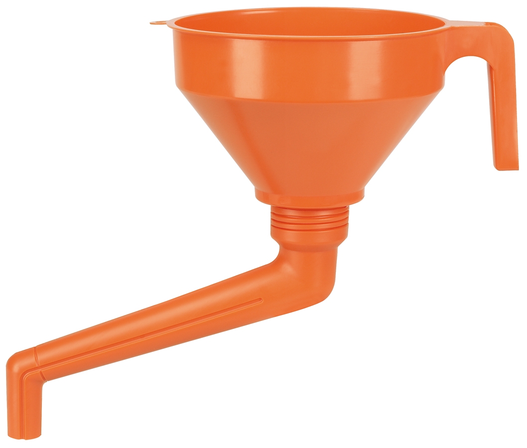 Tratt tillverkad av kraftig olje- och kemikaliebeständig plast med stänkkant och borttagbar mässingsil. Sidoförskjutet utloppsrör cirka 180 mm. Diameter 160 mm, volym 1,3 liter.