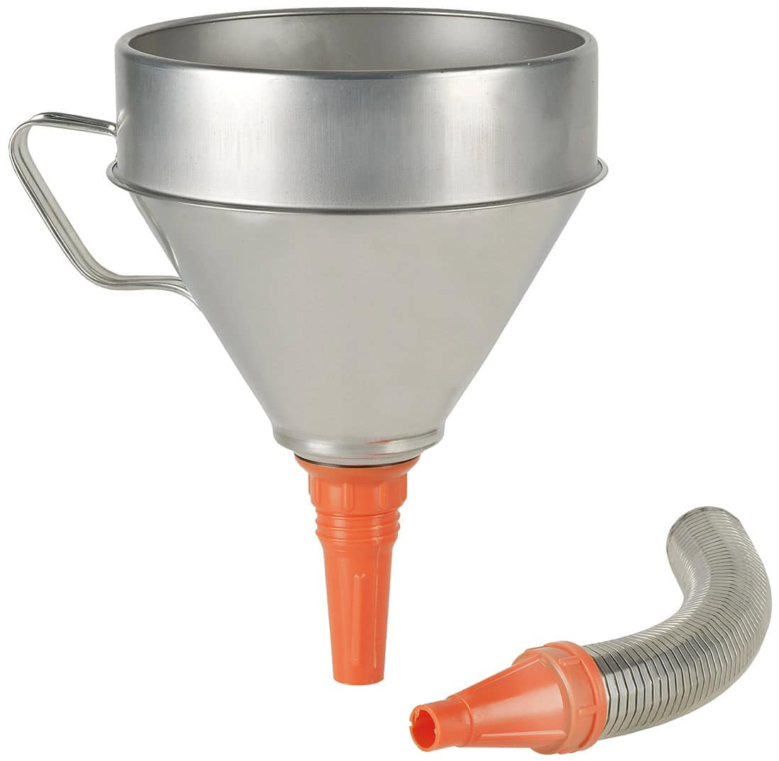 Tratt av bleckplåt med pip (löstagbar och utbytbar) med sil. Överloppsrand och handtag. Kemikalie-, olje-, syra- och bränslebeständig. Trattdiameter 200 mm. Pipens längd 300 mm. Volym 3,2 liter.