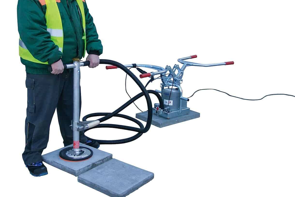 Med integrerad sugplatta för upp till 50 kg (110 Ibs) och snabbväxlingsfunktion. Med detta verktyg kan alla typer av plattor läggas snabbt och framför allt ergonomiskt.
