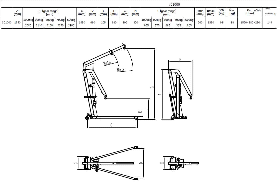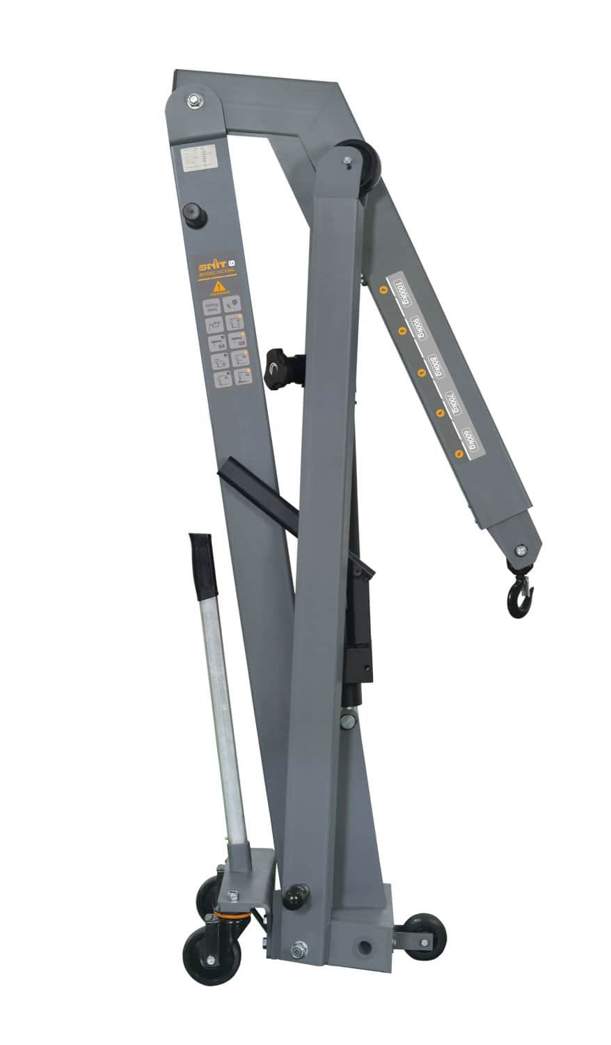 Kan fällas ihop på några få sekunder för snabb och enkel förvaring. Hopfälld kräver kranen minimalt med plats på verkstadsgolvet. Utdragsarm med stor lyftkapacitet, även i det yttersta läget. (*Se kapacitetsöversikt). Hårdförkromad kolvstång och pumpkolv säkrar lång livstid. Inbyggd säkerhetsventil skyddar mot överbelastning. 360° svängbara bakhjul säkerställer att kranen är manöverduglig även med full belastning. Utrustad med 360° vridbar krok. Handmanövrerat dödmansgrepp ger optimal säkerhet vid sänkning.